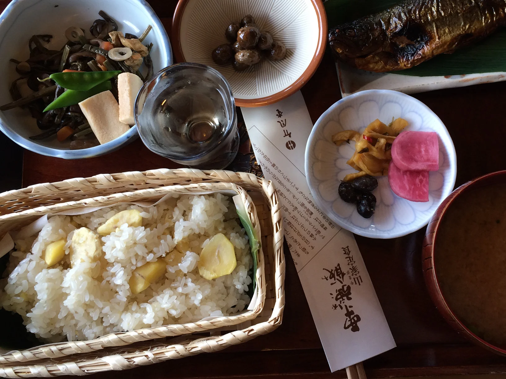 Their lunch menu only consisted of two set meals that were nearly identical. They both came with chestnut sticky rice, miso soup, pickled vegetables, a mushroom dish and tiny potatoes that I initially mistook for small meatballs. I opted for the slightly more expensive set meal that came with an additional dish of trout and a small glass of apple wine. The most interesting part of the meal was that everything had been locally grown and produced. Even the trout had been caught from a local river!