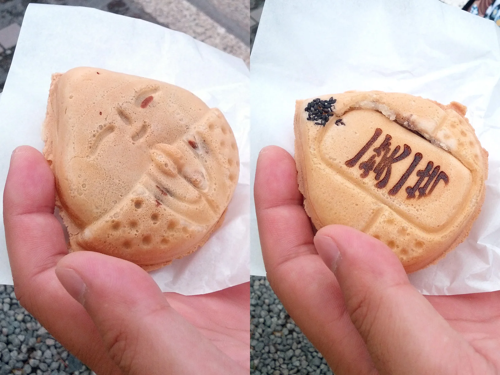 Another chestnut-based snack that I picked up during our walk was something that I believe is called a fukuguri-yaki cake. I wasn’t sure if I was actually going to get to try this as the first shop I visited had a 30 minute wait for their next batch! Fortunately, we came across another shop down the street that had ones ready for sale. This particular version was almond-shaped and made to look like a little man with his hands in prayer. Inside, it had a whole chestnut. Soft, warm and with just the right amount of sweetness, it made for a great snack.